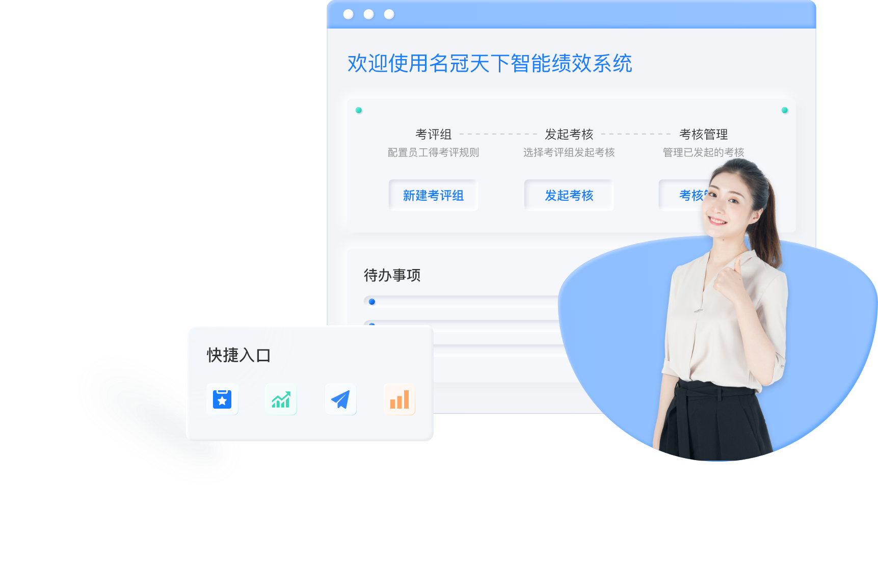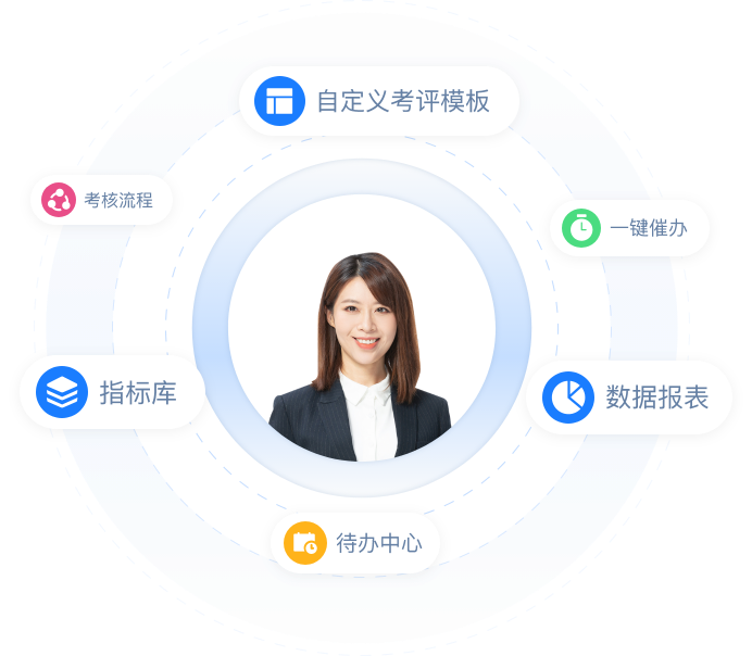 自定义考评模板、考核流程、一键发起绩效考核管理考核进度,一键催办,系统自动算分,自动化等级分布,重置全员考核流程,重置个人流程指标库管理,待办中心,待办自动提醒设置,满分设置,汇总考核数据导出报表。