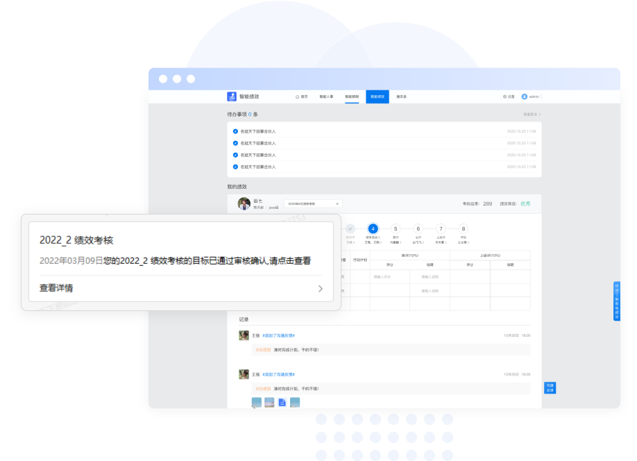 评分通知提醒,考核指标查看、自评查看、考核结果、查询历史考核记录等。