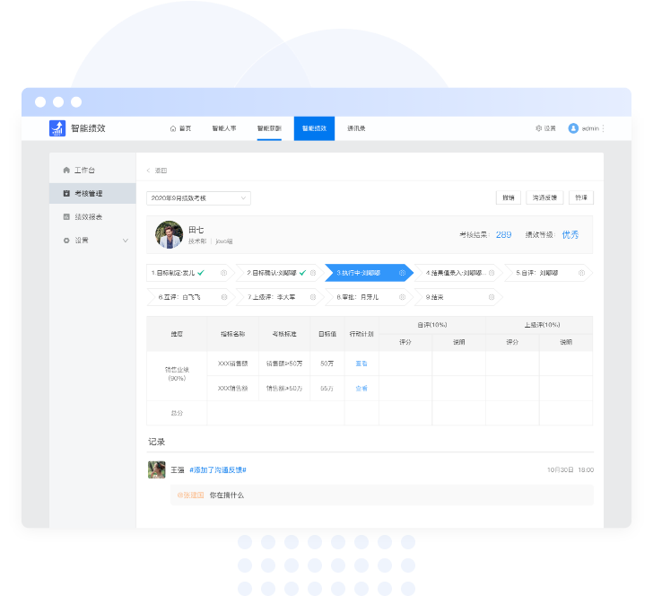 指定部门考核指标,查看部门的考核数据,结果值录入,评分评级,沟通反馈,审核考核结果。