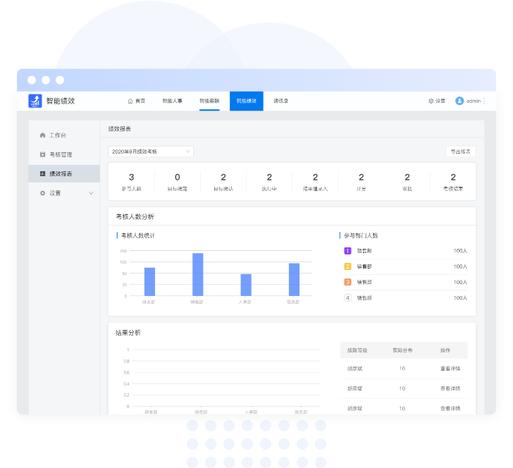 确认部门考核指标,查看企业所有绩效考核数据可视化数据报表,企业绩效排名情况。