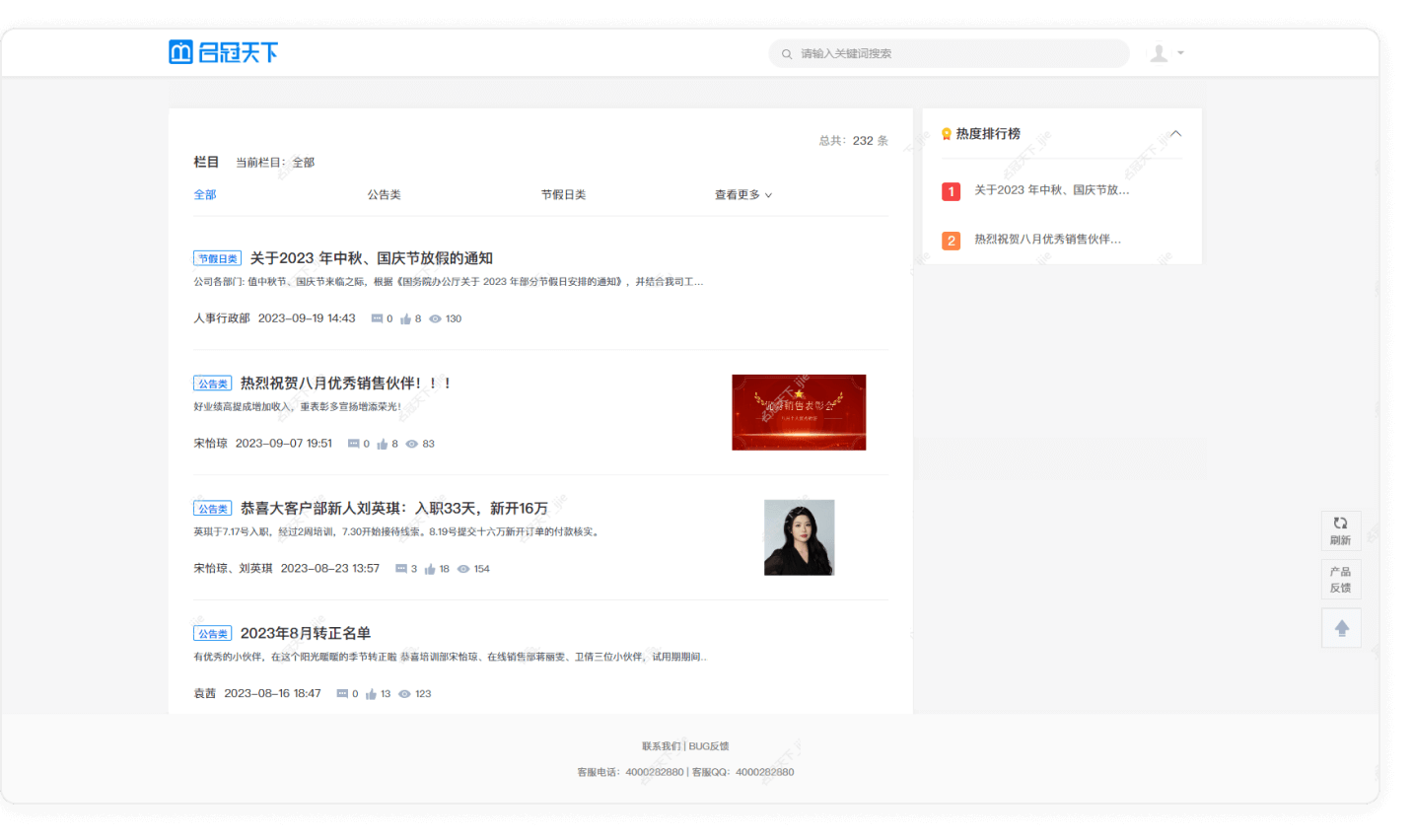 热门文章有排行,文章内容可点赞,评论开闭自有度,更特设文内投票、人员点赞模块,赋能公告实现征集、调研功能,形成群策群力的良好互动态势。
